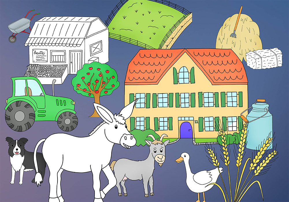 - Pflanzen (Apfelbaum, Getreide, Sonnenblumen, Heuhaufen, Misthaufen, Strohballen )