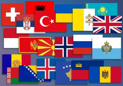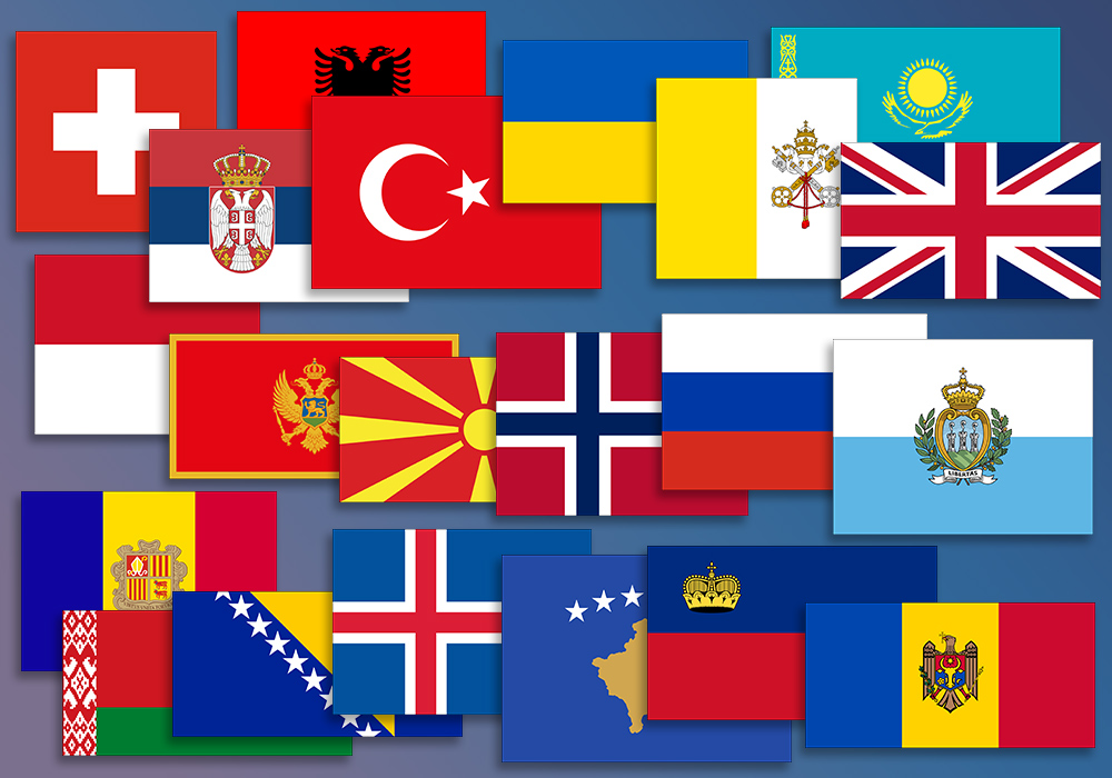 Albanien, Andorra, Belarus, Bosnien und Herzegowina, Island, Kasachstan, Kosovo, Liechtenstein, Moldau, Monaco, Montenegro, Nordmazedonien, Norwegen, Russland, San Marino, Schweiz, Serbien, Türkei, Ukraine, Vatikanstadt, Vereinigtes Königreich