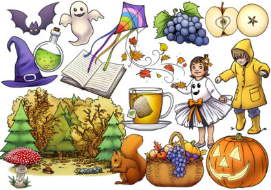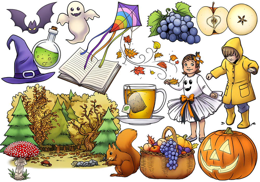 - Natur: Apfel, Eichhörnchen, Fliegenpilz, Fuchs, Baum, Wald, Igel, Kastanie.
