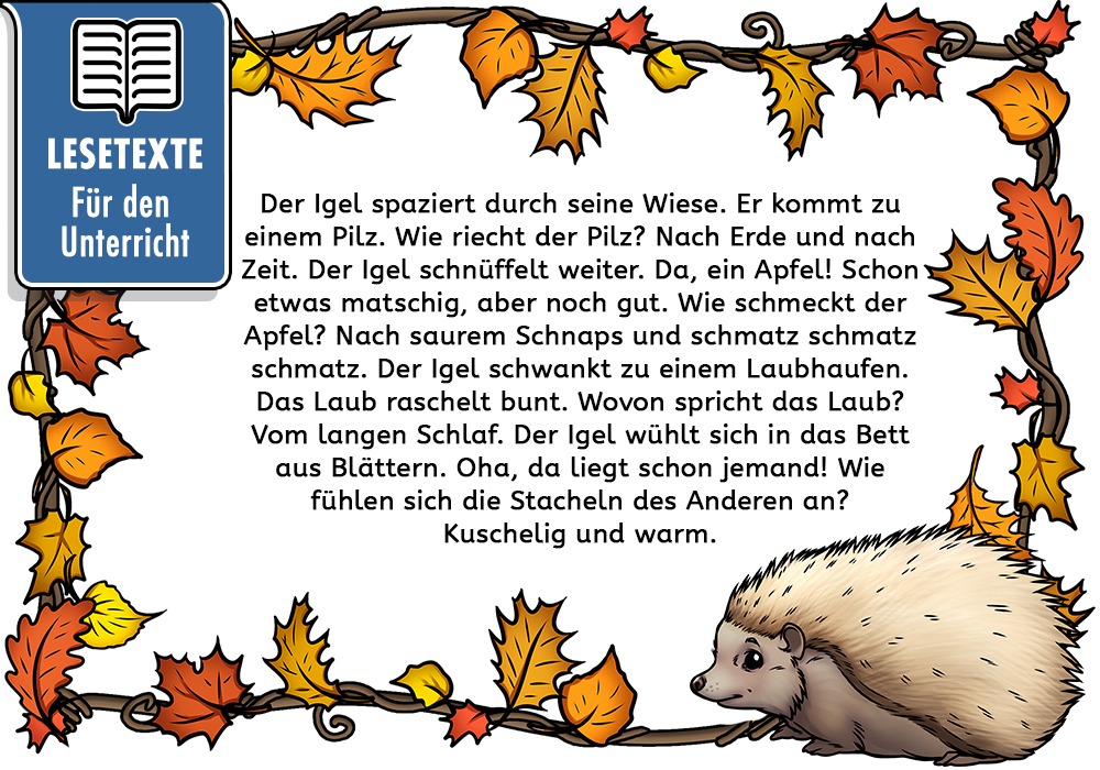 - Warum werden im Herbst die Blätter bunt – und was ist das Geheimnis der roten Farbe?: Dieser Sachtext erklärt, warum das Laub im Herbst seine Farbe wechselt. Schnappt euch das fertige Leseblatt hier. Diesen Text gibt es auch als Version in einfacher Sprache