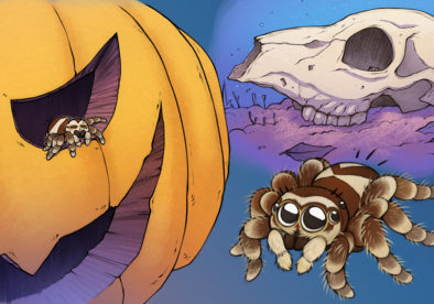 Illustrationen, Fotos, Grusel-Lesetext und Sachtext zum Thema Springspinnen und Halloween.